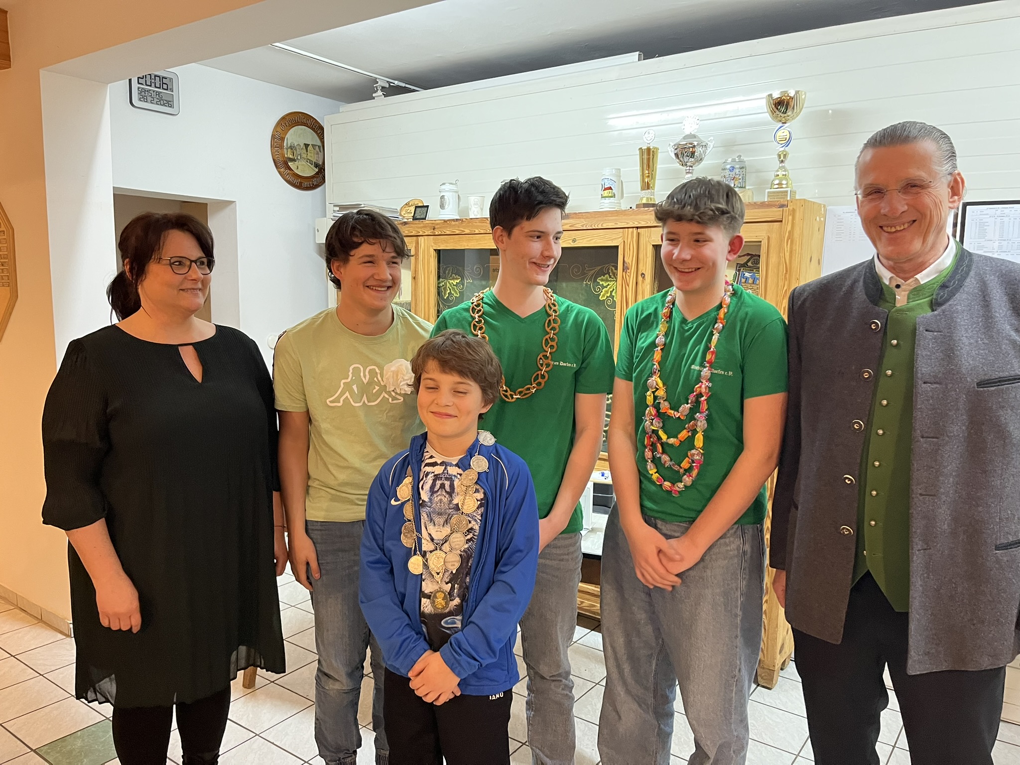 v.l.n.r. Marc Tafelmeier 423.0 Teiler (Temporose), Thomas Rappolder 665.2 Teiler (Zwiebelkönig), Janet Roch-Mauf 56.0 Teiler (Wurstkönigin), Dave Mauf 90.5 T (Bonbonkönig Jugend), oben Jakob Schlenzger 118.7 (Breznkönig Jugend), Hannes Tafelmeier 77.1 Teiler (Schützenkönig Jugend), Werner Huber 38.1 Teiler (Schützenkönig), i.V. Helga Huber für Franziska Huber 67.0 Teiler (Breznkönigin), Bernd Weber (Schützenmeister)